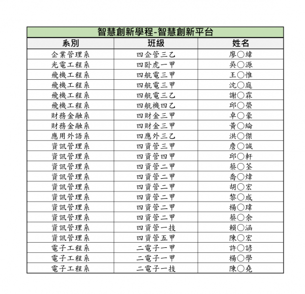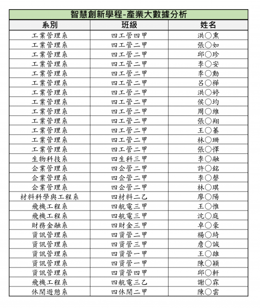 智慧創新學程-產業大數據分析及智慧創新平台 修課錄取名單