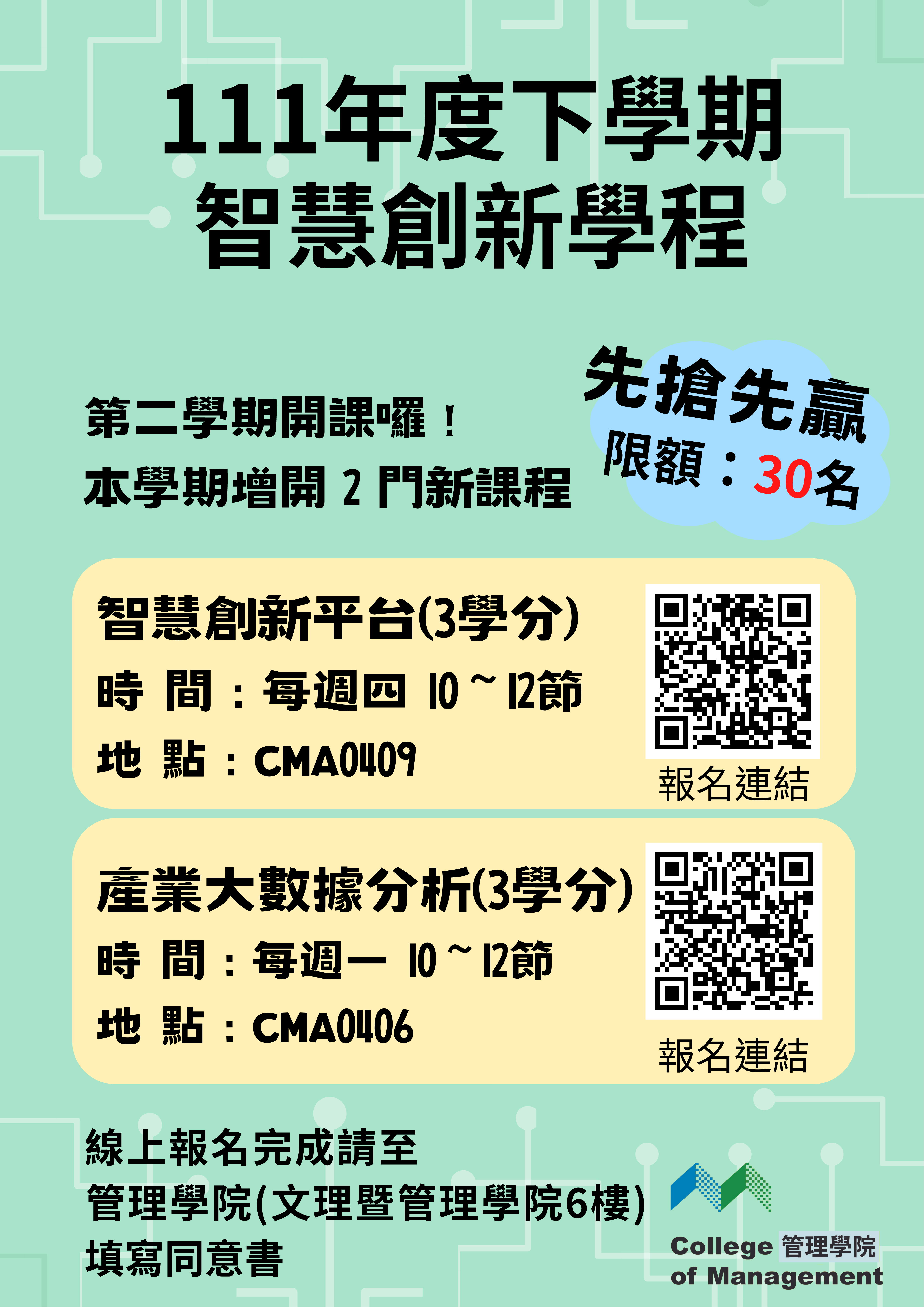 「智慧創新學程」下學期增開課程報名