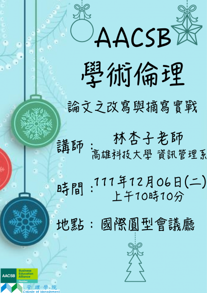各位同學有福了,本次管理學院邀請國立高雄大學-資訊管理系 林杏子老師,學術倫理領域的權威教師,來教導論文改寫與摘寫的方法與注意事項,歡迎有興趣的學生報名參加。